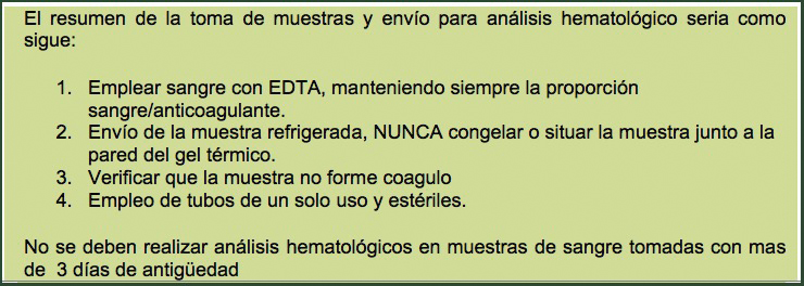 El resumen de la toma de muestras y envío para análisis hematológico seria como sigue: